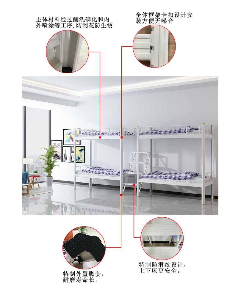 上下鋪鐵床表面全自動(dòng)噴粉處理,0甲醛;中空異型結(jié)構(gòu),卡扣式連接、無(wú)螺絲;100%冷軋鋼板不參假。真正的良心企業(yè)!